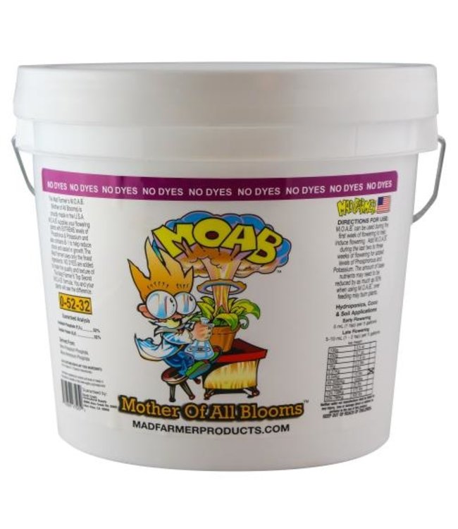 The Mad Farmer's MOAB (Mother of All Blooms) is proudly made in the USA. MOAB supplies your plants with extreme levels of phosphorus and potassium and also contains B-1 to help reduce shock and assist in growth. The Mad Farmer uses only the finest ingredients. No dyes are added to mask the quality and texture of the Mad Farmer’s top secret MOAB formula. You and your plants will see the difference.